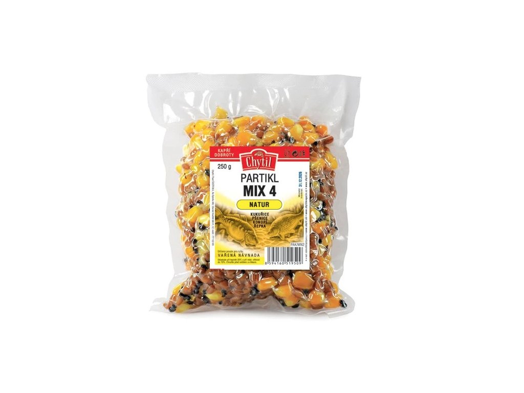 Partikl MIX 4 – jedná se o směs vařených zrn kukuřice, pšenice, konopí a řepky. Tento mix je perfekní pro celoroční použití, díky konopí a řepce pracuje výborně i v chladné vodě. Lze jej použít jako hrubý přídavek do krmných směsí, nebo jej použít zvlášt jako krmení. Pro ještě větší zatraktivnění doporučujeme použít například naši betainovou zálivku. Při výrobě používáme mírnou dávku šetrného konzervantu. Vakuově baleno. Po otevření spotřebujte do 10 dní.