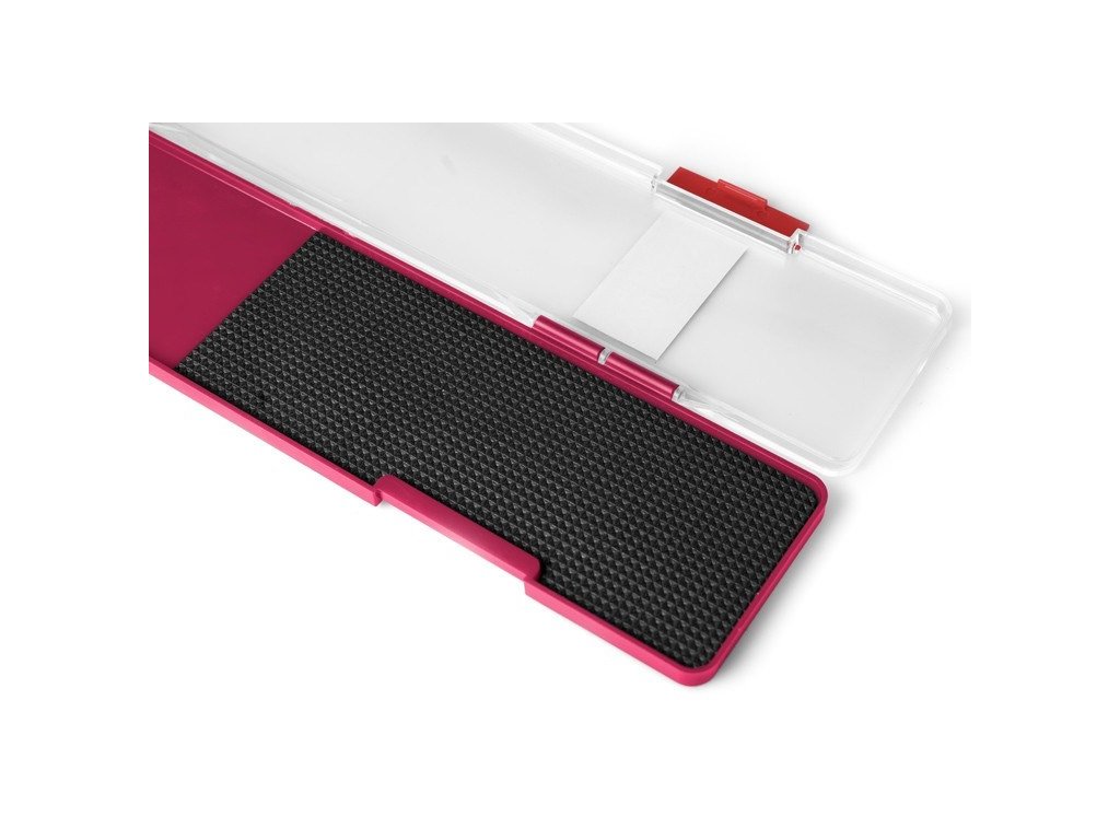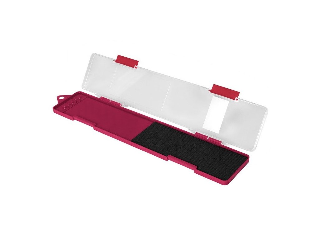 Tento plochý box je vyroben z plastu. Jeho spodní část je vínové barvy, doplněná o plastové výběžky, na které upevníte návazce a o EVA pěnu, kde můžete zapíchnout háčky. Vrchní část je z průhledného plastu, abyste měli dokonalý přehled o umístění návazců. Uzavírá se dvěma klipy.
