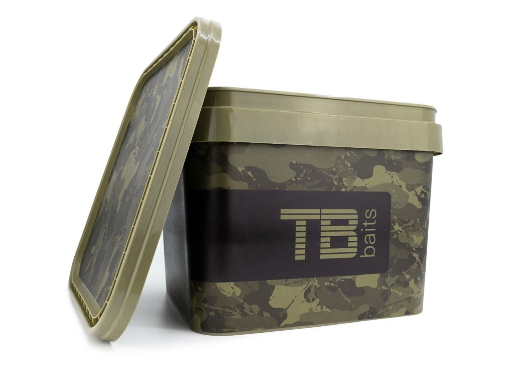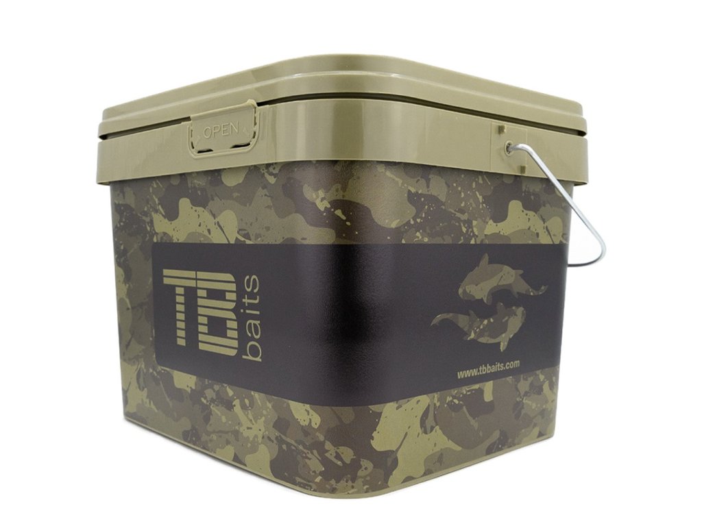 Kvalitní kbelík z tvrzeného plastu s odolnou kovovou rukojetí v designu Camo Carps od značky TB Baits.